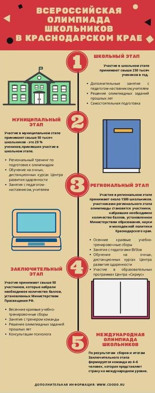 Всероссийская олимпиада школьников – одно из наиболее заметных явлений на образовательном пространстве Кубани. Ежегодно в олимпиадном движении участвует около 400 тысяч учащихся на школьном этапе, более 60 тыс. учащихся на муниципальном этапе, около 4000 учащихся на региональном этапе. Около 100 лучших школьников Кубани принимает участие в заключительном этапе Всероссийской олимпиады школьников.